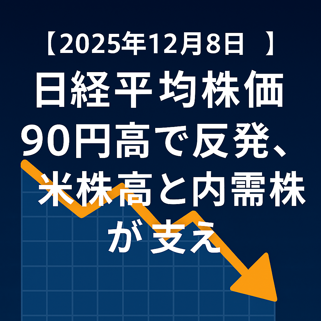 本日(2025年12月8日)の東京株式市場で、日経平均株価は前週末比90円07銭高(+0.18%)の50,581.94円で取引を終えました。2営業日ぶりの反発となり、米株高の流れを受けて内需株中心に買いが広がりました。
