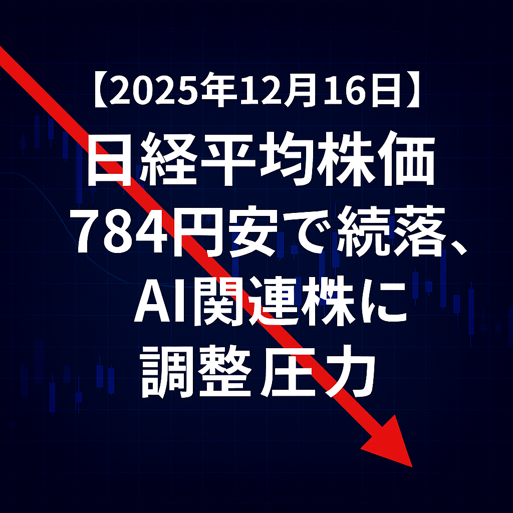 本日(2025年12月16日)の東京株式市場で、日経平均株価は前日比784円82銭安(-1.56%)の49,383円29銭で取引を終えました。前日に続き大幅安となり、今月3日以来約2週間ぶりに5万円台を割り込む展開となりました。