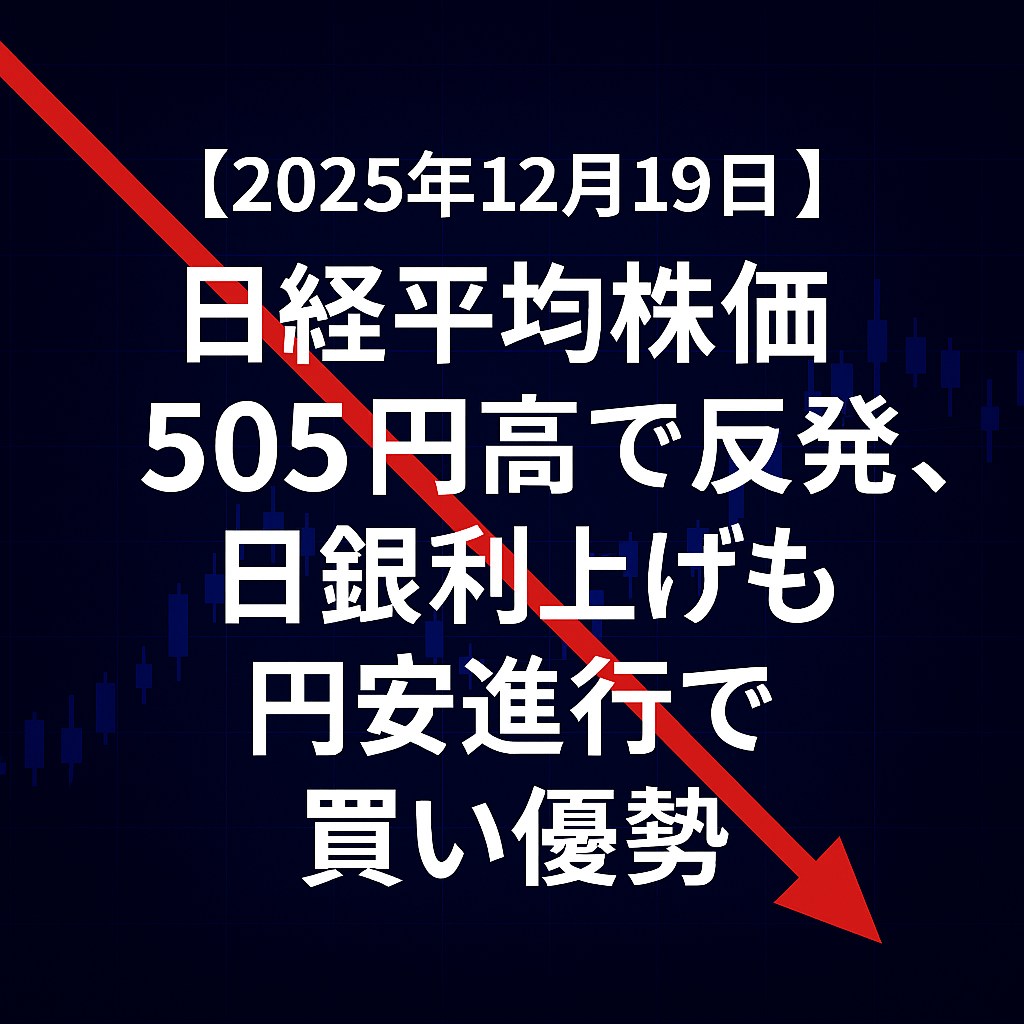 本日(2025年12月19日)の東京株式市場で、日経平均株価は前日比505円71銭高(+1.03%)の49,507円21銭で取引を終えました。前日の米株高や日銀の利上げ発表後の円安進行が好感され、3営業日ぶりの反発となりました。